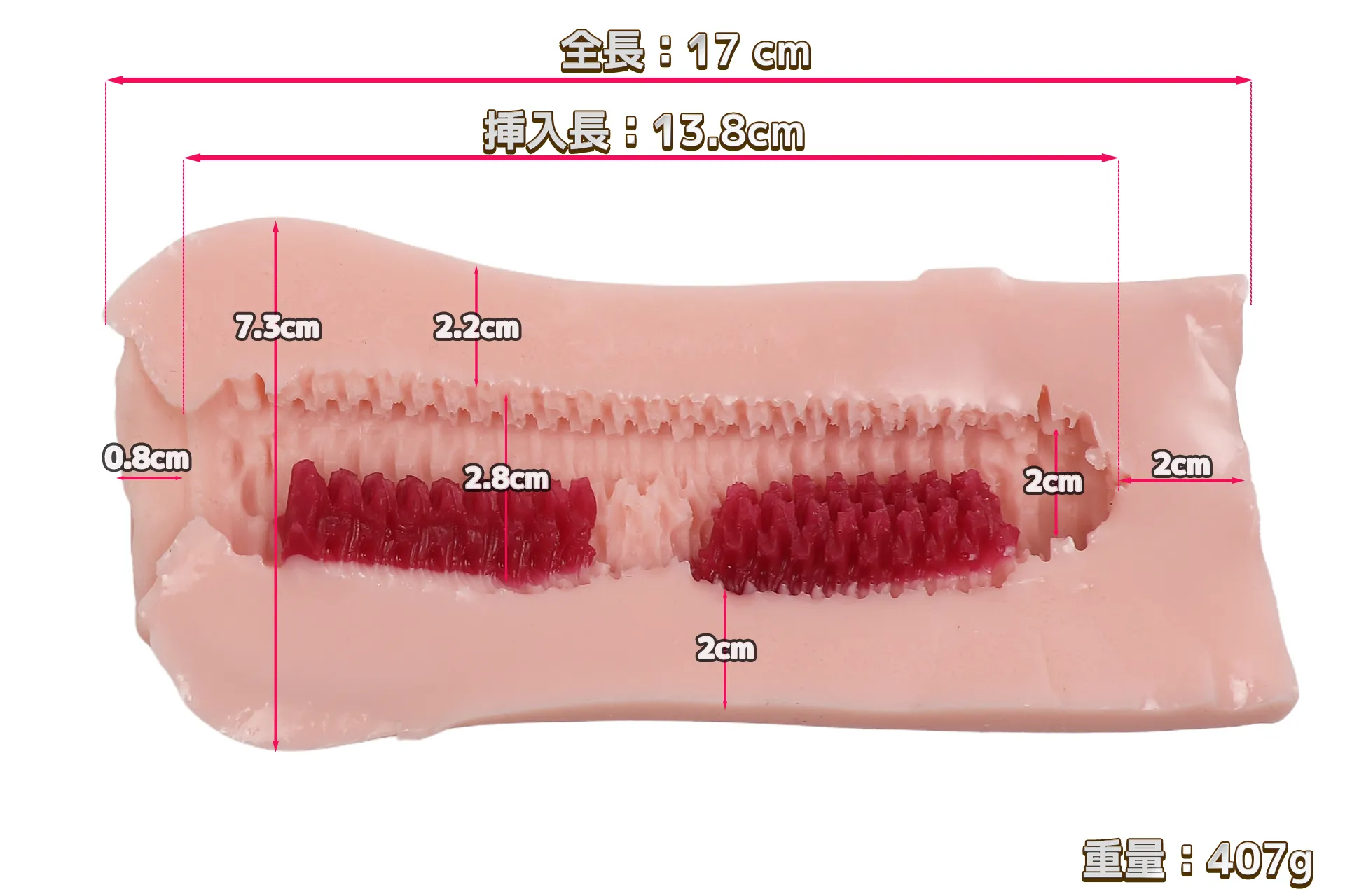 RIDE(ライド)製、ベビータッチ素材を使用したオナホール。内部は壁面に施されたエッジの深いヒダと、下面に配置されたハード素材のイボプレートからなる、ポイント2層構造となっている。![]() |