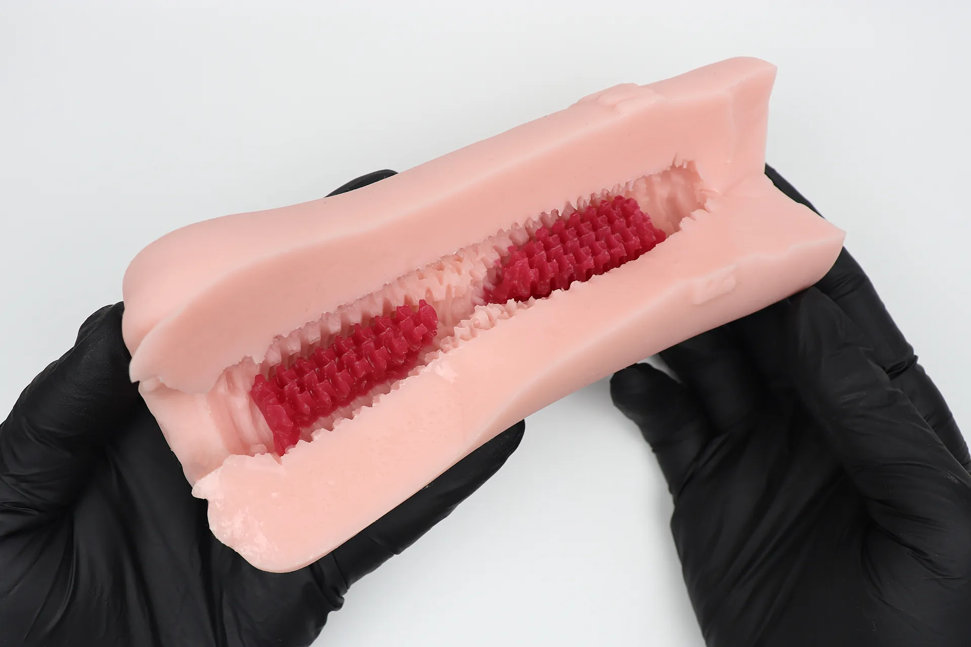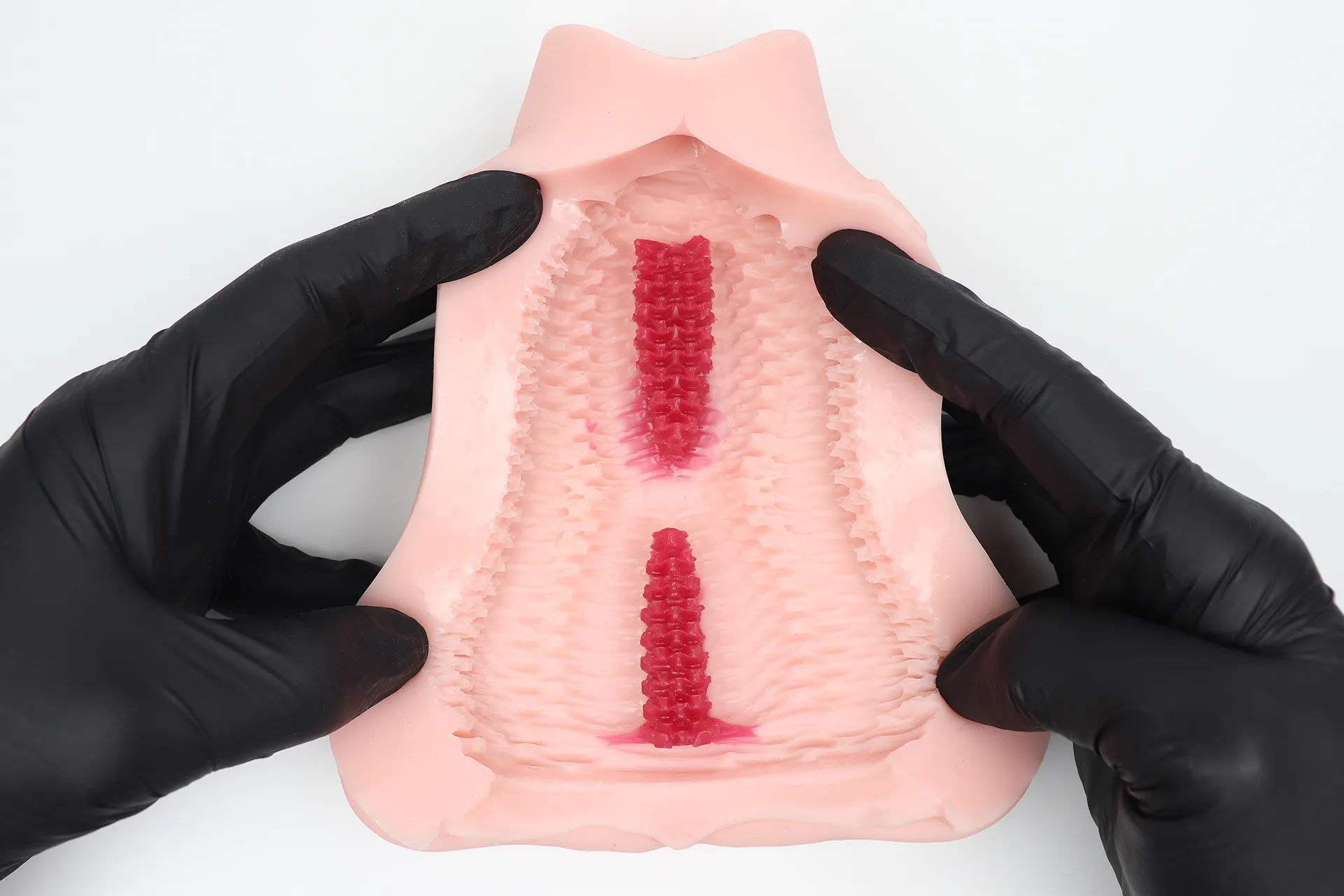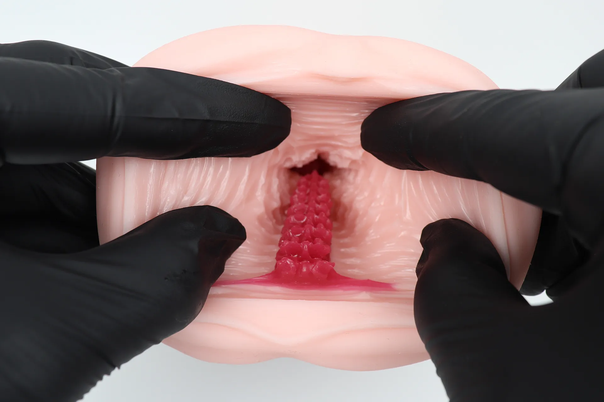 穴はストレート構造で奥にポンプエリアは無く平坦です。非常に緻密で彫りの深いヒダが壁面全体に施され、下部にはハード素材のイボプレートが2枚配置されています。