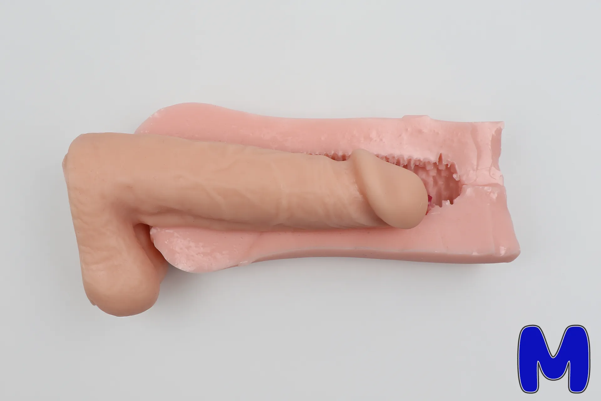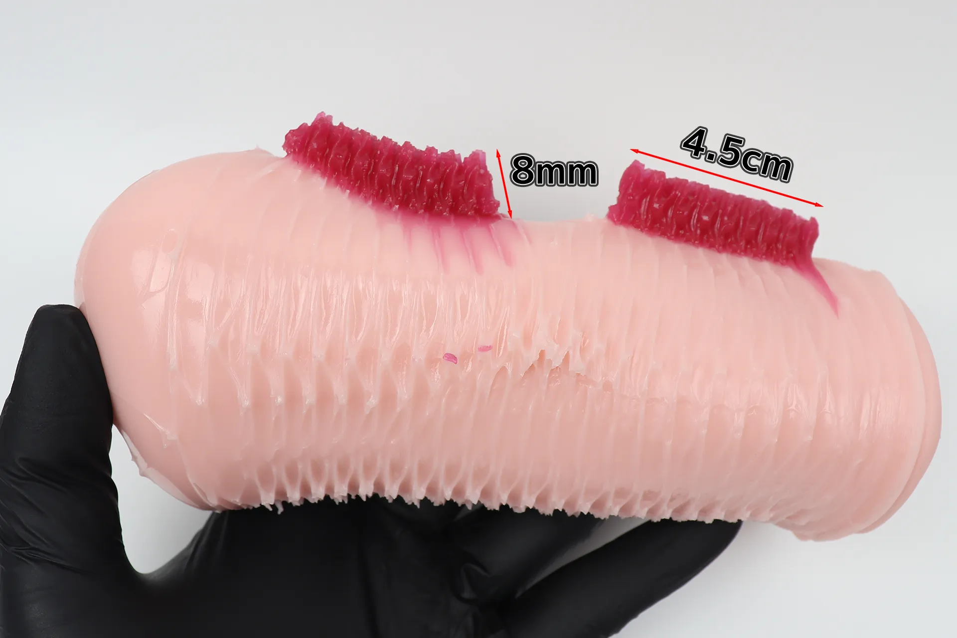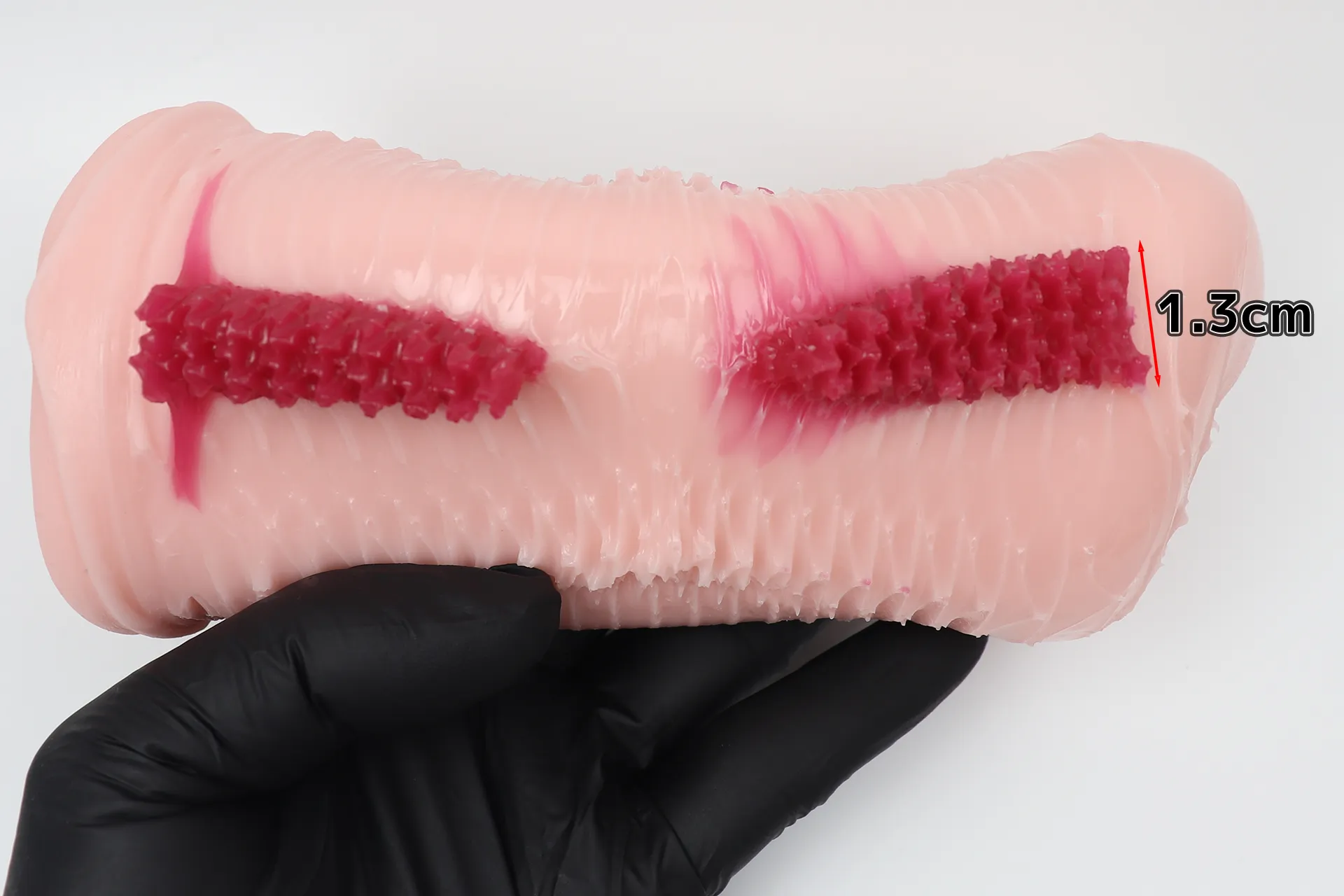 内部は密着感が高く、ペニス全面がヒダとイボによって擦られるの刺激はかなり高めです。ハード素材のイボは尖っていて、チクチク感もあります。
